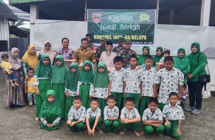 WARTAWAKTU.com|LUWU– Personel Koramil 1403-03/Belopa Kodim 1403/Palopo dipimpin langsung Danramil 1403-03/Belopa, Kapten CBA Sudirman dan ibu-ibu Persit KCK Ranting 4 Koramil 1403-03 Belopa melaksanakan anjangsana, Jum’at berkah di Pondok Pesantren Tahfitzul Qur’an Nurul Yakin Karampa Desa Tumbubara, Kecamatan Bajo Barat, Kabupate Luwu, Jumat (15/5/2025)