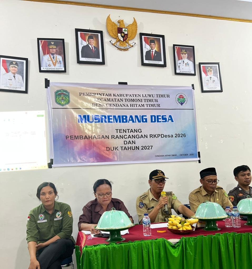 WARTAWAKTU.com|TOMONI TIMUR -Pemerintah Desa Cendana Hitam Timur Kecamatan Tomoni Timur Kabupaten Luwu Timur menggelar musyawarah perencanaan pembangunan desa dalam rangka penyusunan Rencana Kerja Pemerintah Desa (RKPDes) Tahun 2026, Senin (6/10/2025), di Aula Kantor Desa Cendana Hitam Timur.
