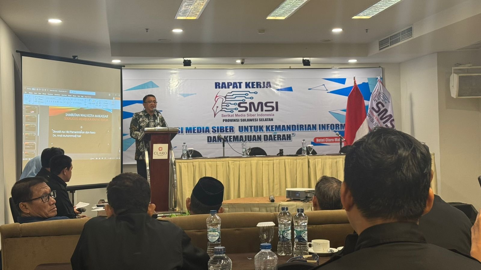 Membacakan sambutan tertulis Wali Kota Makassar, Munafri Arifuddin, saat membuka Raker Perdana SMSI Sulsel di Jade Room Hotel Claro Makassar, Sabtu (27/9/2025), Yasir menyampaikan apresiasi dan harapan besar kepada Serikat Media Siber Indonesia (SMSI) Sulsel.